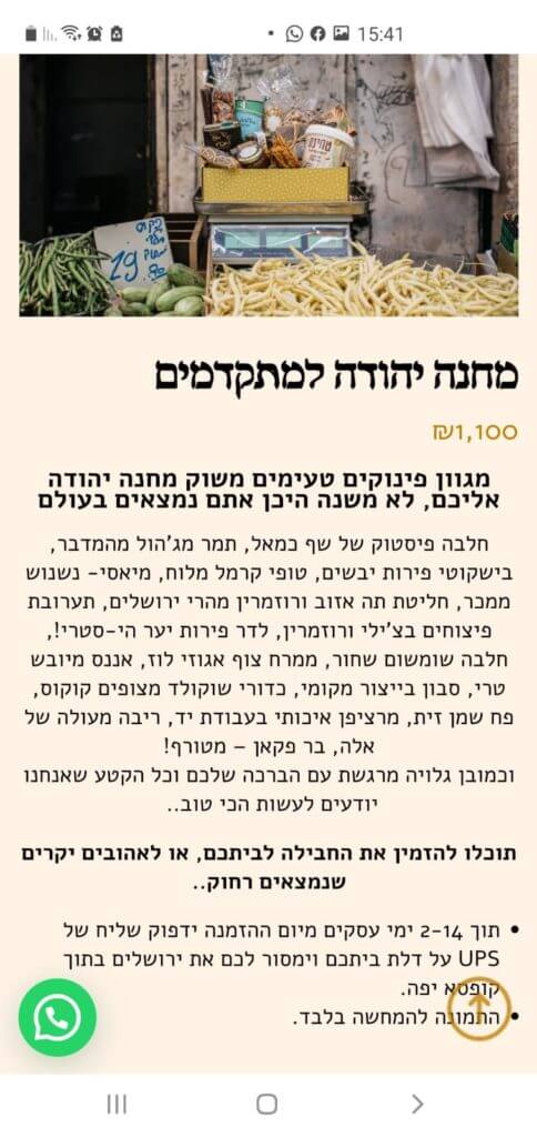 "מדובר בשלל פינוקים טעימים משוק מחנה יהודה אליכם, לא משנה איפה אתם בעולם. החל מ: ₪650